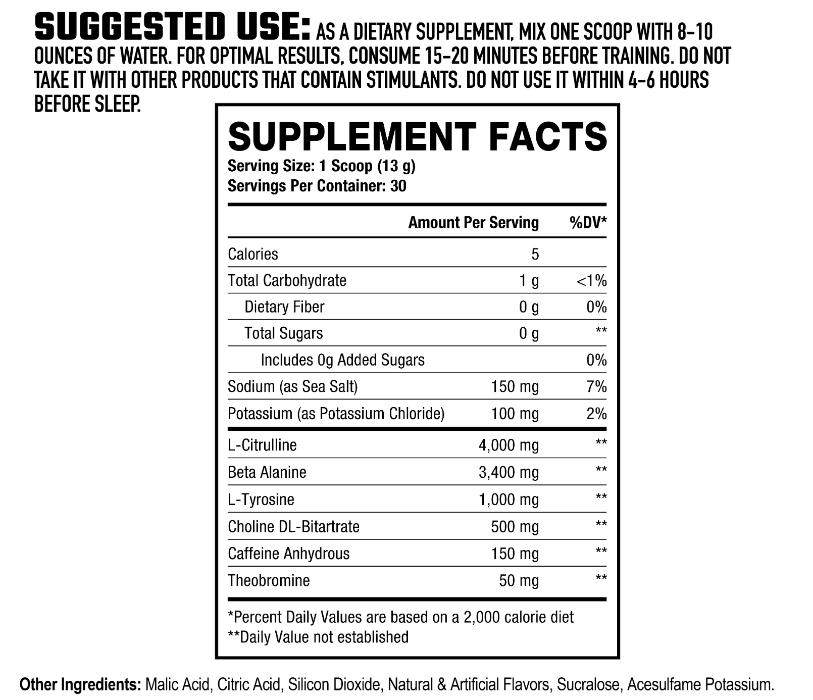 **Suggested Use:** Mix 1 scoop (6–8 oz water) 15–30 min before training. Double scoop for stronger support. Do not use within 6 hours of bedtime.