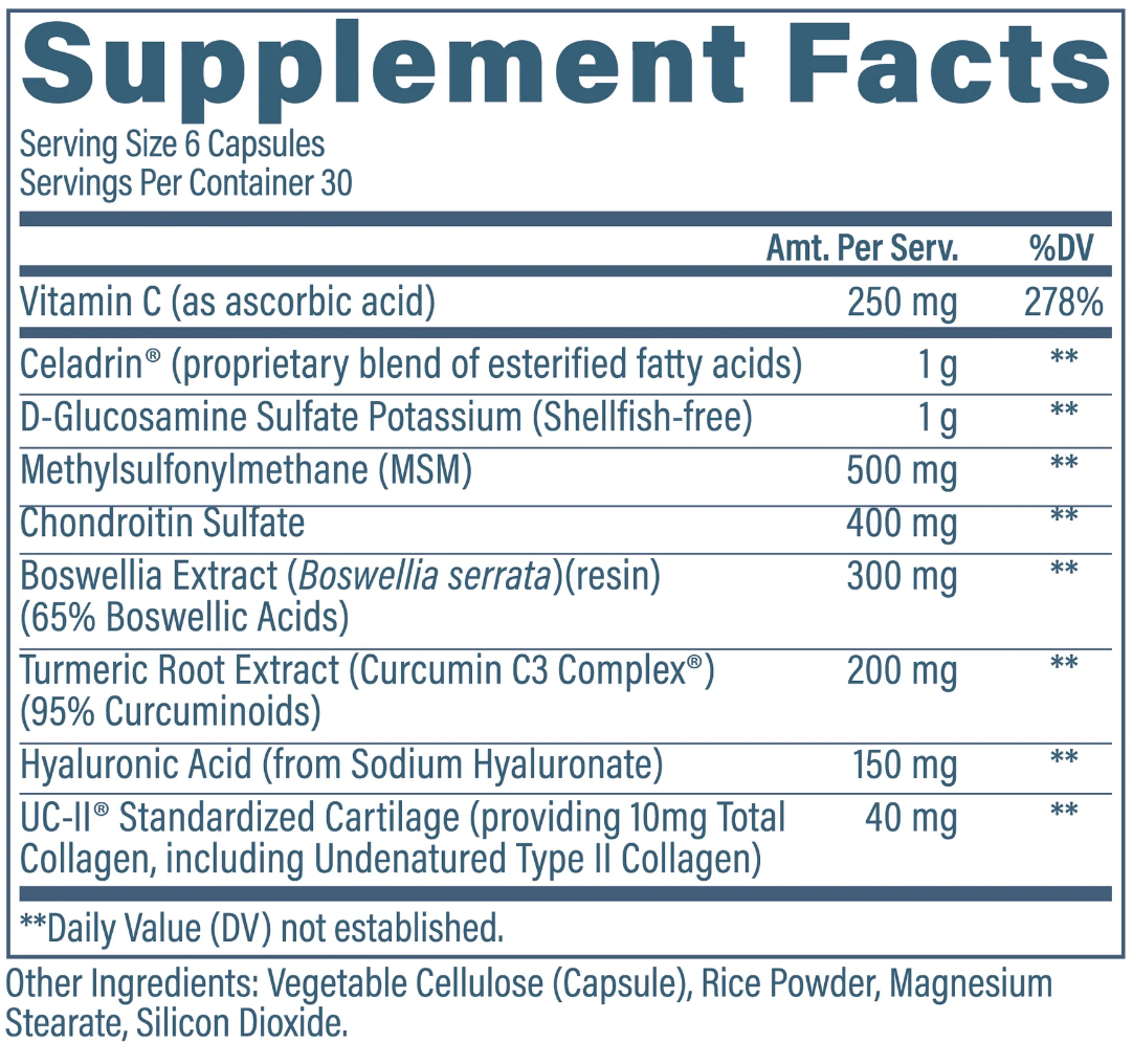 Joint Support is designed to provide comprehensive support for cartilage repair, lubrication, and inflammation reduction. Powered by UC-II, it aids in rebuilding damaged cartilage, promoting resilient joints. Hyaluronic Acid helps keep your joints hydrated, acting as a natural shock absorber for smoother movement. To reduce joint pain, Boswellia and Celadrin work together to calm inflammation. Additionally, the formula includes Glucosamine, MSM, and Chondroitin to ensure optimal joint function and long-term support.